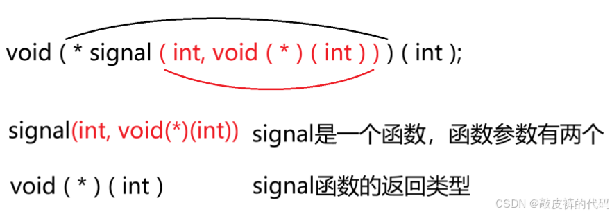 - signal函数的返回类型是void(*)(int)这种类型的函数指针,该指针指向的函数参数是int,返回类型是void