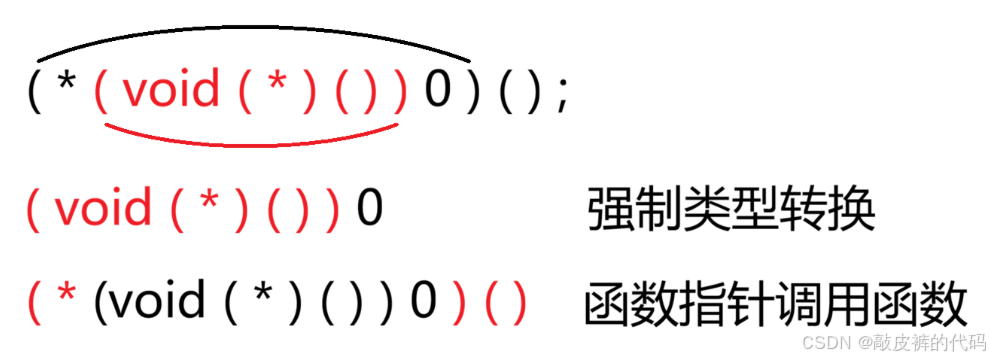 - 把0这个整型数值,强制类型转换成一个函数的地址,这个函数没有参数,返回类型是void