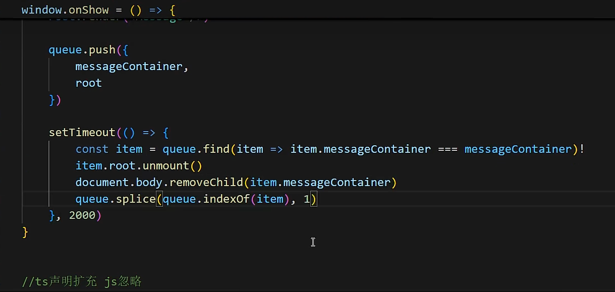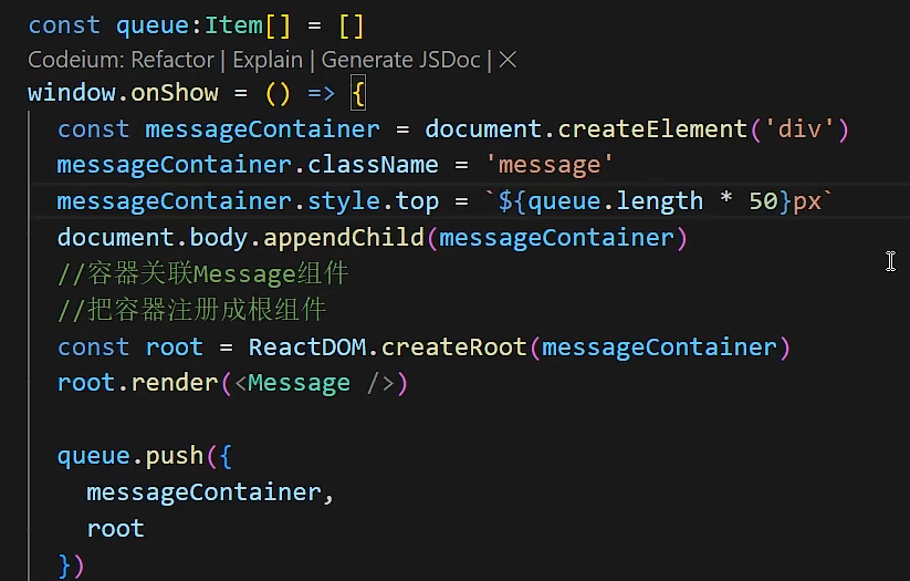 新建一个方法绑定到window全局变量上 ,(在window上新建一个方法,需要使用declare进行全局声明),方法内部新建一个容器挂载到Dom上,使用reactDom新建一个root节点,然后使用render方法进行渲染message组件。通过数组控制弹窗的位置(避免重叠),设置定时器销毁创建的容器和渲染。