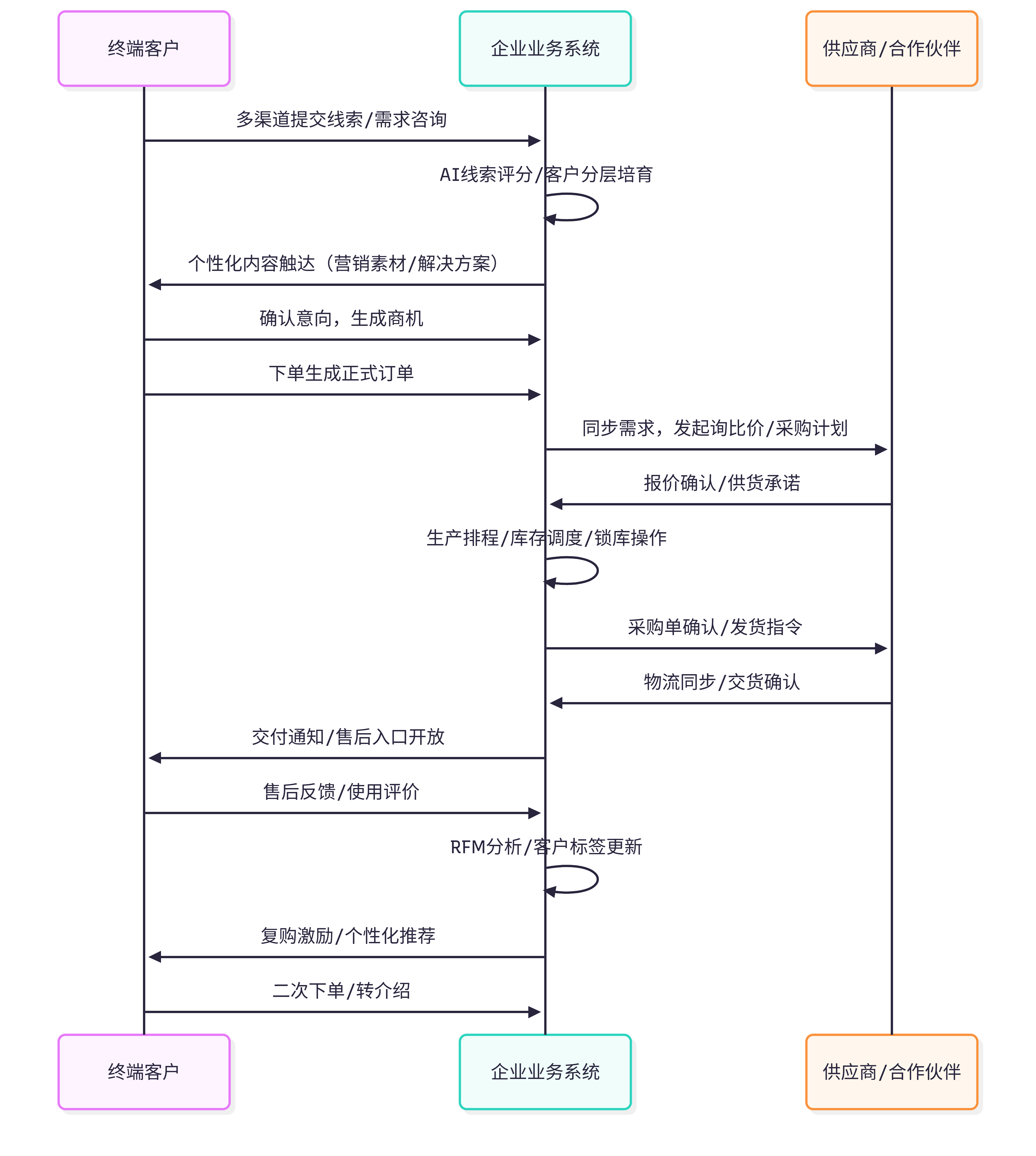 企业系统->>C: 复购激励/个性化推荐