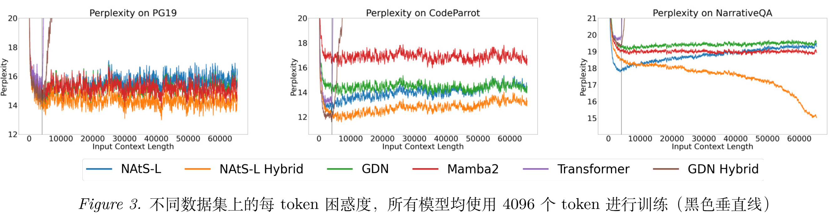 【结论二】GDN Hybrid 虽然在训练长度附近可能更低,但一旦超过训练长度就容易失效;NAtS-L 和 NAtS-L Hybrid 能更好保持困惑度