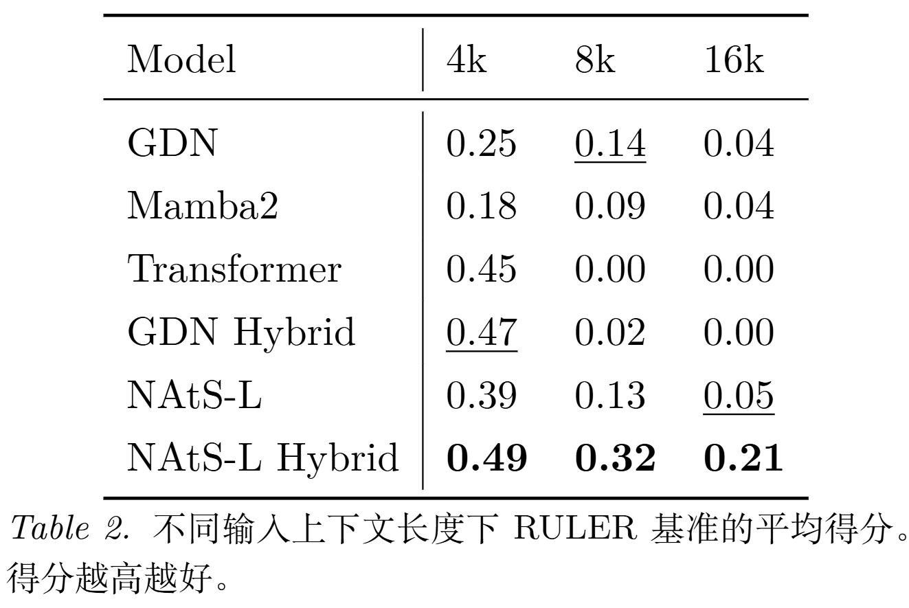 【结论三】Transformer 和按层混合的 GDN Hybrid 在长检索任务上的效果基本掉到 0;而 NAtS-L Hybrid 还能保持 0.21,并且在 4k/8k/16k 都是最好