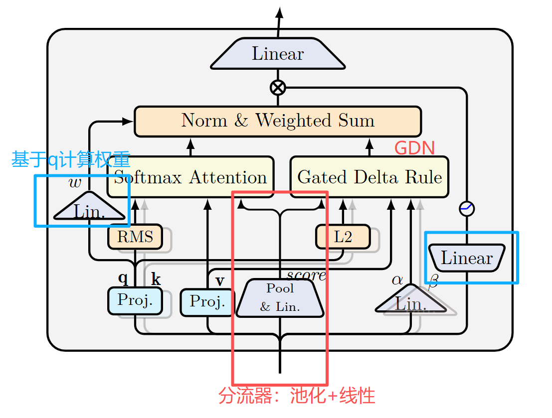 目前只在 softmax 和 GDN 两种操作里选,未来可以把更多线性/稀疏/混合注意力也放进可选菜单