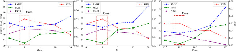 图5.脑部数据集实验结果的视觉检查。第二行和第四行表示红色虚线矩形标记的放大区域。定量结果放置在预测图像的底部。CBCT的显示窗为[-1000, 340] HU。CT和sCT的显示窗为[-160, 240] HU。