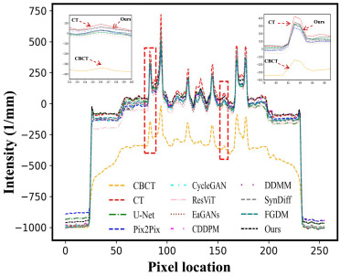 在内部盆腔测试数据集上,所提出的模型在所有评估指标上均表现出卓越性能,取得了最低的RMSE(46.62±11.77)和MAE(32.45±7.93),以及最高的SSIM(0.95±0.04)和PSNR(45.02±6.14)。与原始CBCT以及所有基线方法(包括U-Net、GANs和DDPMs)相比,模型显著提升了图像质量。定性分析(图2)显示,本模型生成的合成CT图像与原始CT扫描图像最为相似,尤其在子宫肌瘤病理变化和金属植入伪影处理上表现突出。图3的1D强度剖面图也进一步证实了模型在像素强度上与CT图像的接近性。在外部盆腔数据集上进行外部验证时,尽管所有方法的性能均有所下降,但本方法在所有评估指标上仍保持领先地位,展现出强大的泛化能力(表2和图4),能够有效减少其他方法引入的内部结构改变和灰度值误差。针对不同部位的头部数据集,本研究将仅在盆腔数据集上训练的模型进行测试,结果(表3和图5)表明本方法在所有指标上均优于其他方法,并能恢复更多的纹理细节,尤其在U-Net表现不佳的情况下,本模型仍能显著提升图像质量。消融研究证实了所提生成器、AHFO模块、DMFF模块和EABC模块的有效性,并验证了在CT分支中使用WT、CBCT分支中使用FFT的策略是最佳选择(表4、表5、表6)。此外,本研究通过引入不同噪声水平的实验,验证了模型对不完美CBCT图像(包括金属伪影和噪声)的鲁棒性(图7)。