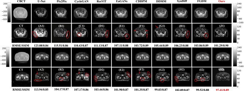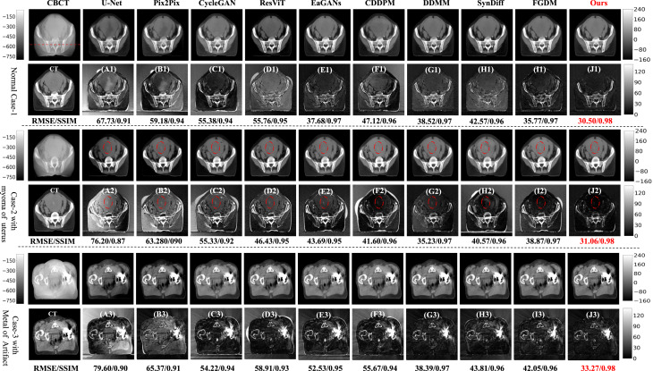 图2.盆腔内部测试数据集实验结果的视觉检查。此处选择了三个代表性病例:一个来自健康个体;一个来自子宫肌瘤患者,由红色虚线椭圆标记;一个来自髋关节金属植入患者。(A1-J1)、(A2-J2)和(A3-J3)是CT与相应预测合成CT之间的绝对差异图像。CBCT的显示窗为[-800, -50] HU。CT和合成CT的显示窗为[-160, 240] HU。