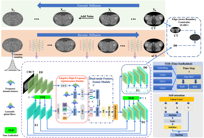 图1.整体框架分别包括完整的正向和反向扩散过程。E1和D1分别是合成CT生成主分支中的编码器和解码器。E0是用于引入额外CBCT信息的编码器。D0是用于引入边缘感知边界约束额外损失函数的辅助解码器。