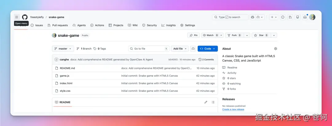 | 22:31 | "推送到刚才贪吃蛇仓库作为 readme" | 自动提交 README |