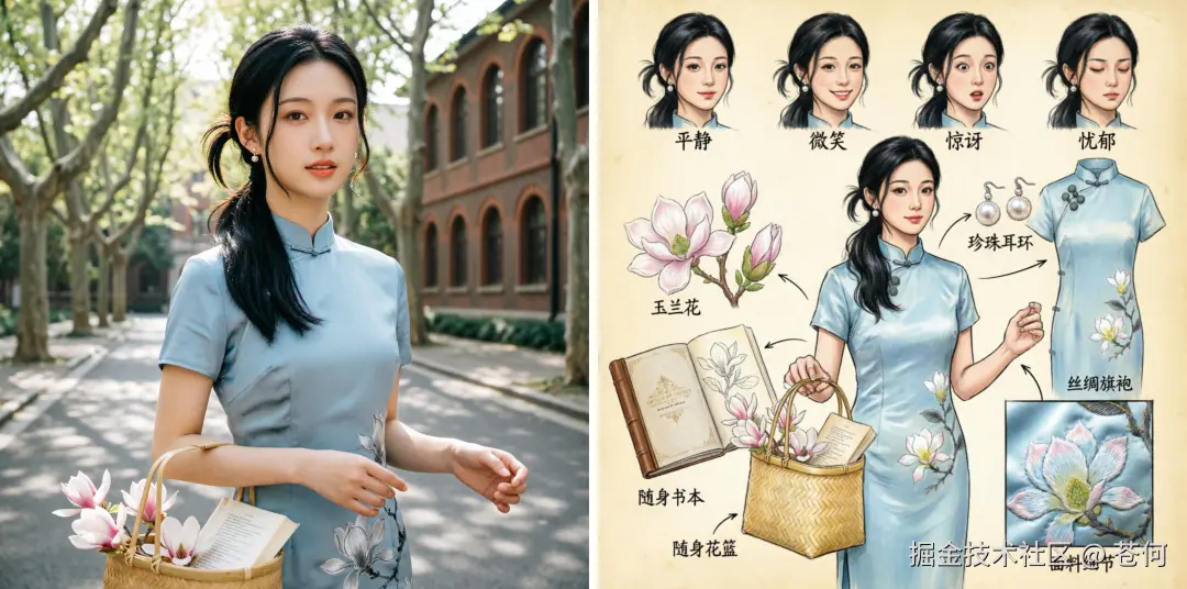细节拆解(右中侧): 右中侧展示一件提取出来的淡蓝色绸缎旗袍,下方标注"丝绸旗袍",并有一个箭头从女生身上的旗袍指向此处。细节拆解(右下侧):右下侧展示旗袍面料的放大材质特写,突出绸缎光泽与玉兰花刺绣纹理,标注"面料细节"。细节拆解(左下侧):左下侧展示一件提取出来的手工竹编篮子,篮内盛放着粉白色的玉兰花和一本书,标注 "随身花篮"。细节拆解(右上侧):右上侧展示一对珍珠耳环,下方标注"珍珠耳环",并有一个箭头从女孩身上的珍珠耳环指向此处。细节拆解(左中侧):左中侧展示一本硬壳精装书,下方标注"随身书本",并有一个箭头从女孩身上的书本处指向此处。细节拆解 (左上侧):左上侧展示一些玉兰花,下方标注"玉兰花",并有一个箭头从女孩的随身花篮的花朵处指向此处。背景风格: 整体采用复古纸张底色,手绘设计稿风格,线条干净,色彩清新。