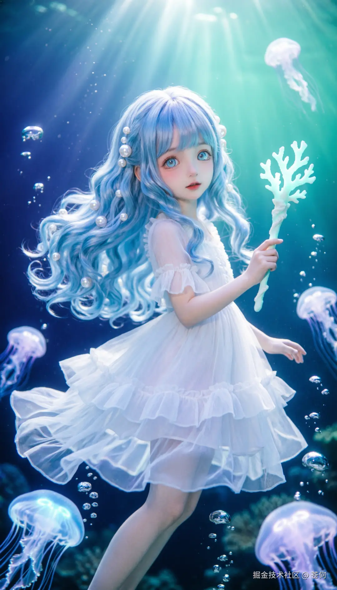 一位拥有水蓝色微卷长发的动漫少女,发丝轻盈如丝绸,发梢点缀着透明的珍珠发饰,散发着微弱的光芒。她穿着一件纱质的白色层叠荷叶边长裙,裙摆像水母的触手般飘逸。她悬浮在半空中,身体呈舒展的流线型,单手轻托着一支由珊瑚构成的发光魔杖,眼神充满好奇与纯真。画面采用仰拍构图,少女处于画面黄金分割点,周围环绕着发光的半透明水母和细小的气泡。背景是深蓝到浅绿渐变的深海奇观,带有极强的水晶质感与丁达尔光效。整体色彩明亮且带有奇幻的蓝紫色调,虚化处理的背景增强了空间的深邃感。