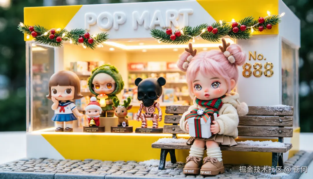参考神老师的提示词做了些改动:一个透明亚克力展示盒内的微缩场景,呈现泡泡玛特(POP MART)精品店面。店面采用标志性的明亮黄色与白色拼接外立面, 装饰着带有迷你松枝、红色浆果和LED串灯的节日花环, 顶部有"POP MART"的标志性气泡字体大型标识, 以及No. 888闪耀的金色数字装饰。