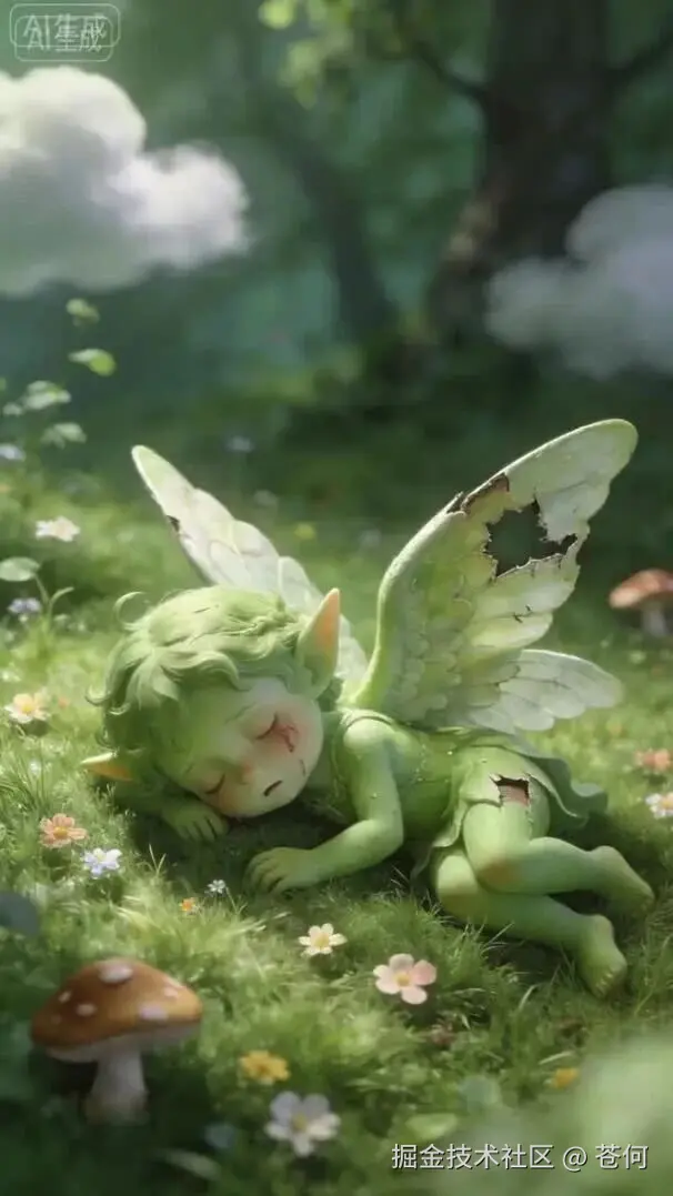 爱丽丝梦游仙境风格,一个绿色的小天使躺在草地上,受伤的样子,俯视图