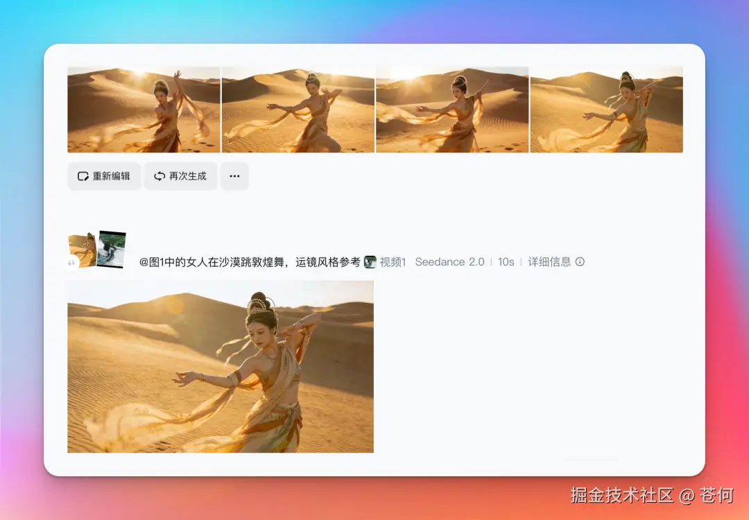 同样先在即梦生成沙漠跳敦煌舞的女子图片,然后上传一段多角度转场的视频。