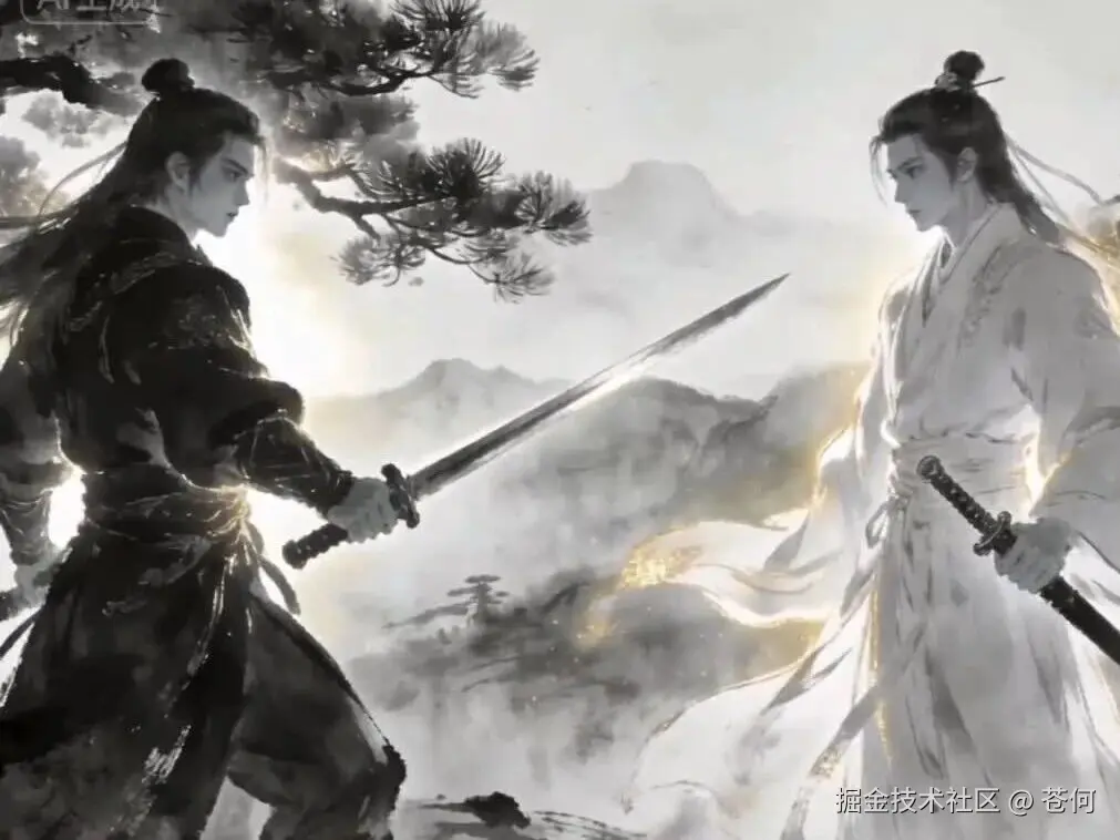 @图片1图1中的黑衣男子恨恨的说:"都说剑仙榜一你我难分胜负,今天我就来同你一决高下"。图片1中的白衣男子不屑的说:"要打就打,哪那么多废话"。说完,两人便开始打斗起来,打斗动作参考视频1,打斗场景风格参考图片1,可根据需要对场地进行合理化扩展。