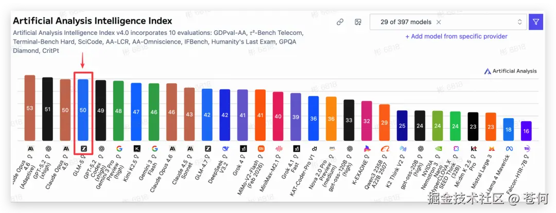 关于 GLM 5,官方是这么说的,「在全球权威的 Artificial Analysis 榜单中,GLM-5 位居全球第四、开源第一」。我截了个图: