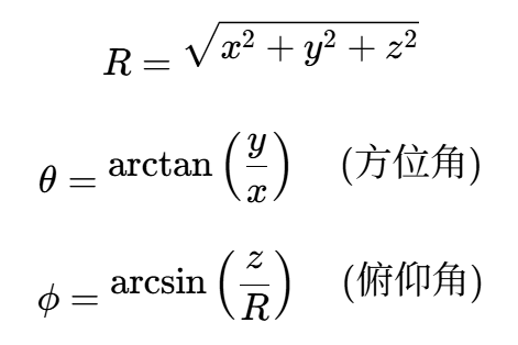 注意:这里我们定义方位角在x-y平面内,从x轴旋转。俯仰角是目标与x-y平面的夹角。不同的坐标系定义可能不同,但原理一致。