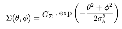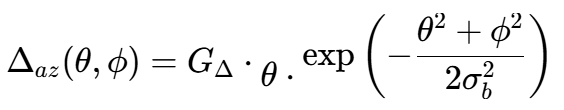 其中,GΣ是和波束峰值增益,σb是波束宽度参数。注意,这里我们假设方位和俯仰的波束宽度相同,且方向图可分离(即可以写成方位和俯仰的乘积)。实际中,两个维度的波束宽度可能不同,我们可以分别用σaz和σel。