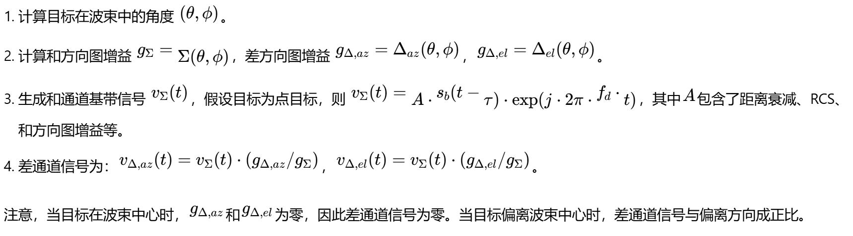 注意,这里我们假设和、差通道的传播路径、延迟和多普勒完全相同,唯一的区别在于天线方向图增益不同。这是因为和、差波束是由同一个天线孔径通过微波网络(如魔T)同时形成的。