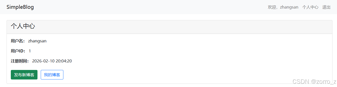 至此,完整的用户系统已经实现:从数据库设计、模型验证、控制器处理、视图展示到最后的权限保护,形成了一个安全、完整的闭环。用户需要先注册、登录,才能访问个人中心和后续的博客管理功能。