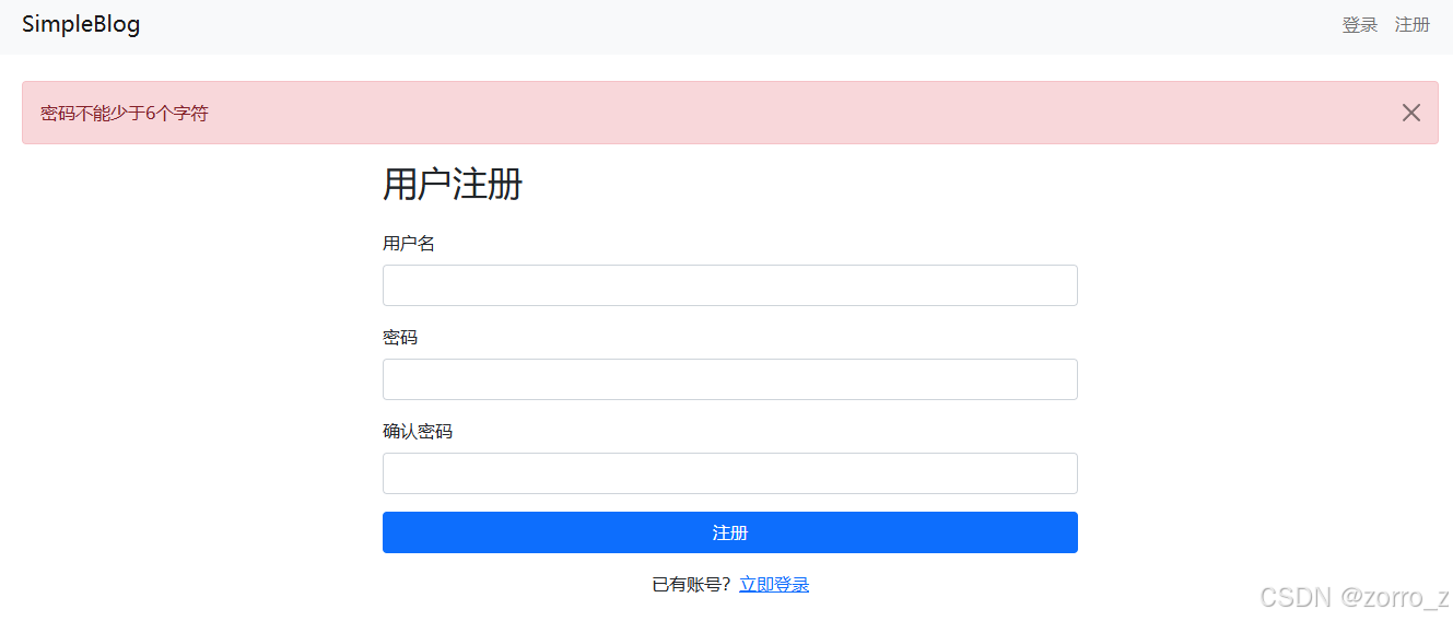 点"注册",填个用户名和密码,密码输短了会有红色提示,两次不一致也会报错。这些错误提示都是验证器里自定义的。