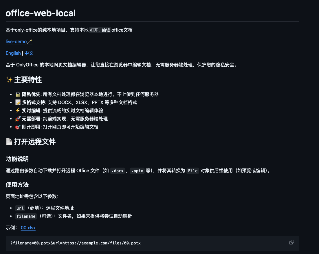 而 onlyoffice-web-local 的取舍是: 保留编辑器能力 + 用浏览器本地转换替代一部分服务端能力 ,把"重服务"压缩成"轻前端"。项目说明中明确提到:用 x2t-wasm 替代 OnlyOffice 服务,并利用 OnlyOffice WebSDK 来实现编辑。