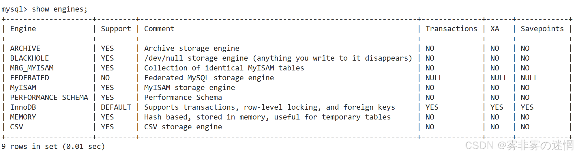 mysql> show engines; -- 表格显示