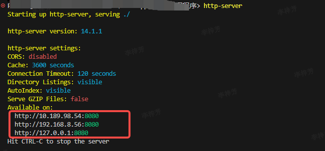 2、切换到index.html所在目录下,执行 http-server即可,以下是我执行的结果,任意点击我圈出来的这几个链接,即可请求成功