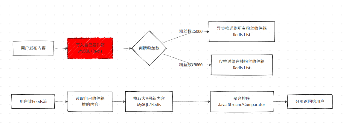 - 写逻辑:用户发内容,先写入自己发件箱,后台异步推送到粉丝收件箱(Java 异步线程 / 消息队列)。