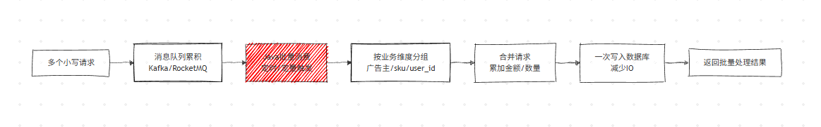 - 批量实现:Java 消费者从消息队列批量取消息,按广告主 ID 分组,累加扣费金额(10 次合并为扣 10 元),一次更新数据库。