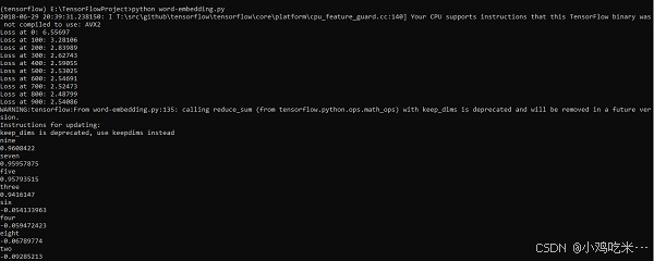 上述代码运行后会得到以下输出 ------seven nine five three six four eight two(系统提示)你的 CPU 支持的 AVX2 指令集,未在当前编译的 TensorFlow 二进制文件中启用第 0 步损失值:6.55697第 100 步损失值:3.28106第 200 步损失值:2.83989第 300 步损失值:2.62743第 400 步损失值:2.59055第 500 步损失值:2.57025第 600 步损失值:2.54691第 700 步损失值:2.52473第 800 步损失值:2.48799第 900 步损失值:2.54086