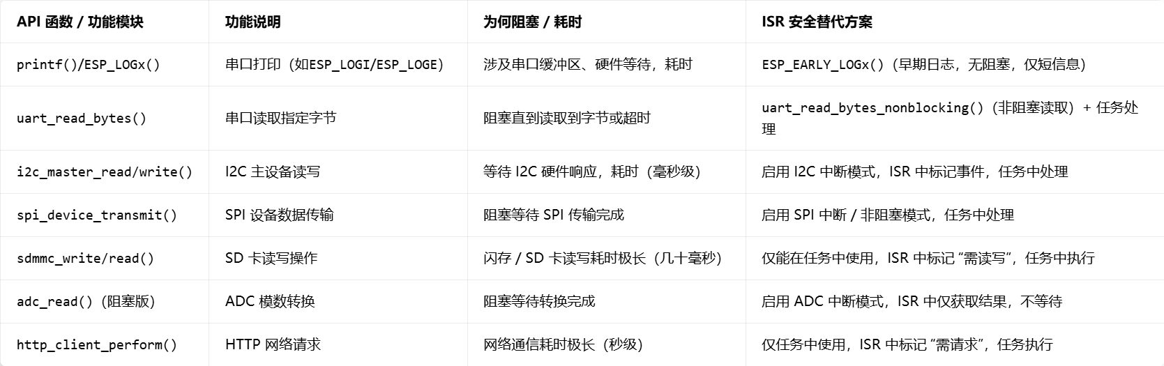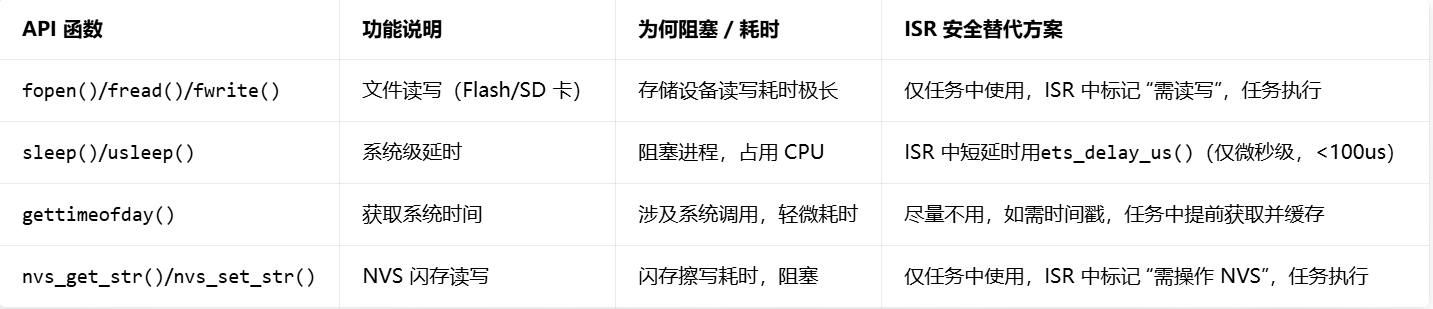 - 耗时API:执行时间长且不确定(毫秒级及以上),会占用 CPU 大量时间,导致中断响应超时或其他紧急事件被阻塞。