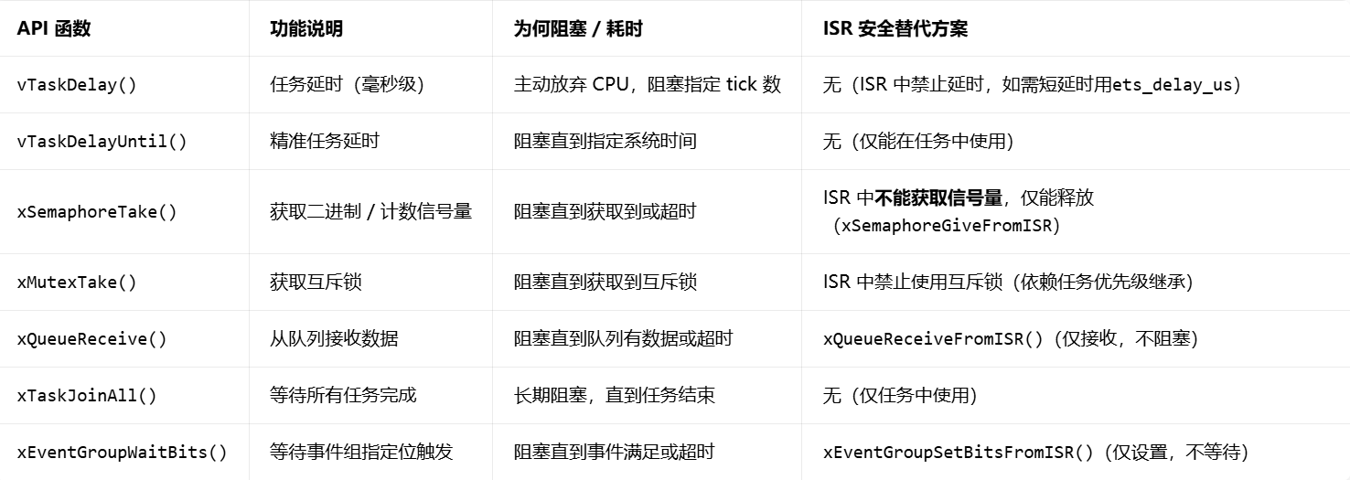 - 阻塞API:调用后会让当前任务放弃 CPU 使用权,进入「阻塞状态」,直到满足条件(如超时、信号量可用)才返回,依赖 FreeRTOS 调度器。