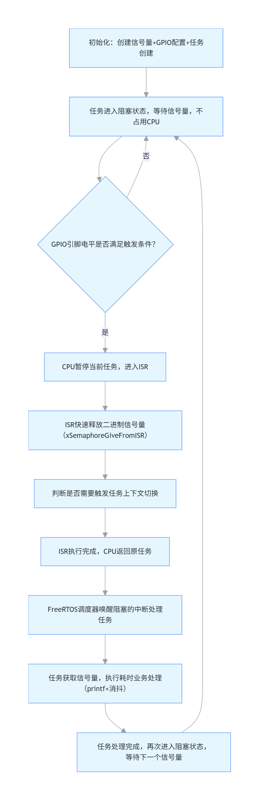 执行完这个函数后,gpio_interrupt_sem指向的二进制信号量从"不可用(计数值 0)" 改为 "可用(计数值 1)",让阻塞等待这个信号量的任务能被唤醒。