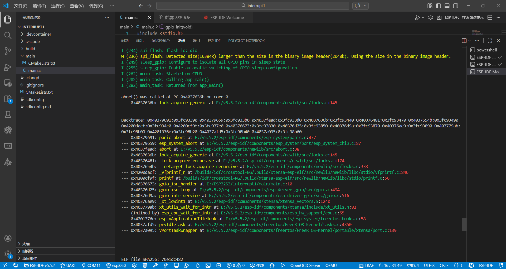 这样的写法,在编译器里是不会报错的,甚至编译烧录都不会出现任何异常,但当我们按下按钮查看监视器时,会发现,芯片并没有正常输出,而是按钮按下一次就重启一次: