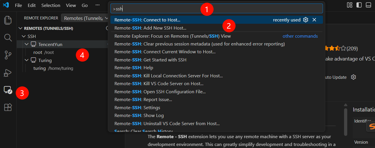 然后按ctrl+shift+p调出命令行输入ssh,使用2中的Add New SSH Host..后,配置了ip和密码就可以登录,之后就可以使用3和4快捷登陆了,而且可以设置默认打开的文件夹。`ctrl+``可以快捷调出命令行。