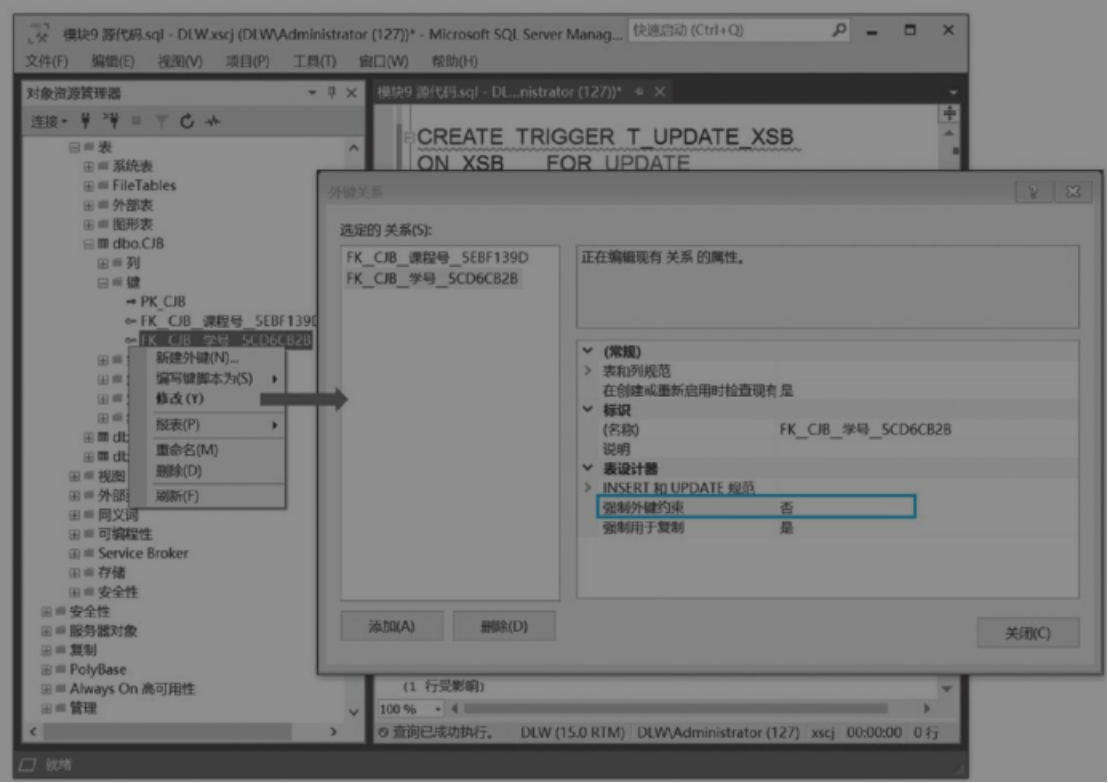 **提示:**由于CJB表中的"学号"列上有外键约束,而外键约束默认是强制约束(即不能修改XSB和CJB表中的学号值),如果要实现本例中的级联更新操作,需要将外键的强制约束设置为"否