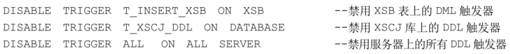用户可以禁用或启用指定的触发器,比如:某个表上的DML触发器、某个数据库作用域的DDL触发器、在服务器作用域中的DDL触发器,如下所示。