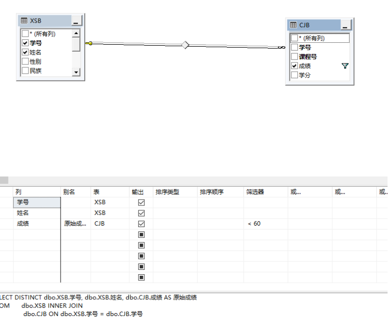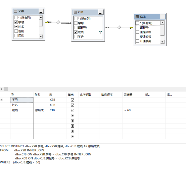 | USE XSCJ GO CREATE VIEW V_不及格学生信息(学号,姓名,原始成绩) AS SELECT DISTINCT XSB.学号,姓名,成绩 FROM XSB,CJB WHERE XSB.学号=CJB.学号 AND CJB.成绩<60 GO SELECT * FROM V_不及格学生信息 |