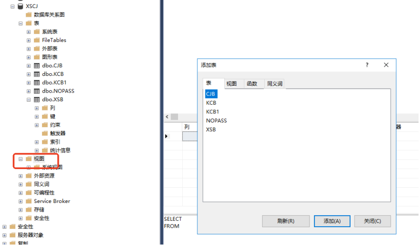 1)在"对象资源管理器"窗口依次展开"XSCJ"数据库中的"XSB"表,定位到"视图"节点。