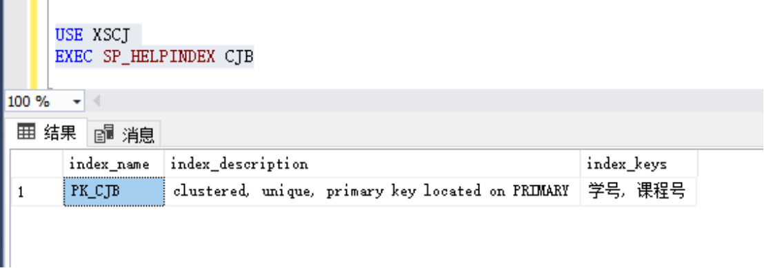 使用系统存储过程查看成绩表CJB的索引信息如图所示。结果集中包括3列:index_name表示索引的名称;index_description为索引说明;index_keys列出了索引列。