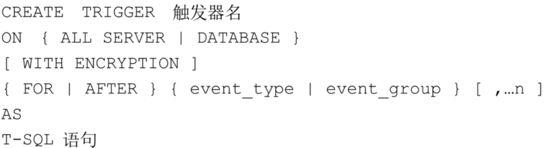 - event_group:预定义的T-SQL语言事件分组的名称。执行任何属于event_group的T-SQL语言事件后,都将激活DDL触发器。如DDL_TABLE_EVENTS语言事件分组涵盖CREATE TABLE、ALTER TABLE、DROP TABLE语句。DDL触发器用于在数据库中管理任务,如:审核和控制数据库操作。