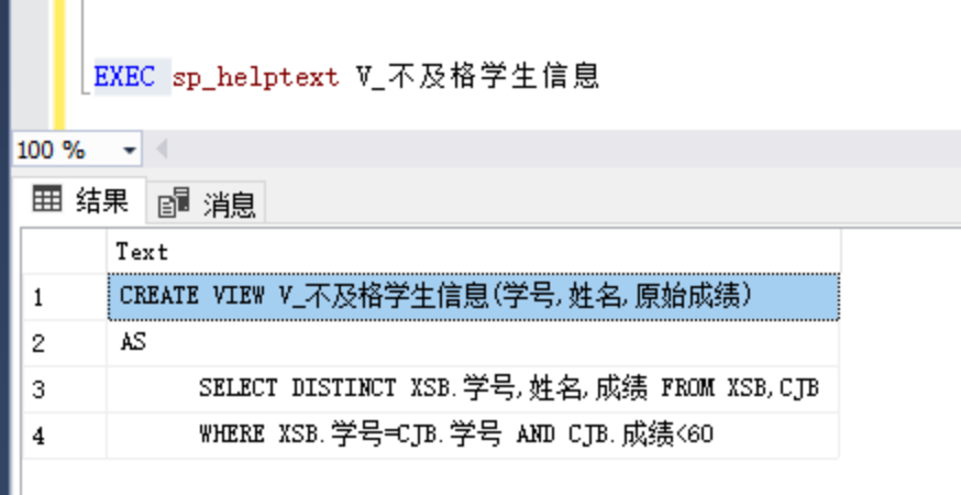 查看XSCJ数据库中的"V_不及格学生信息"视图的定义。