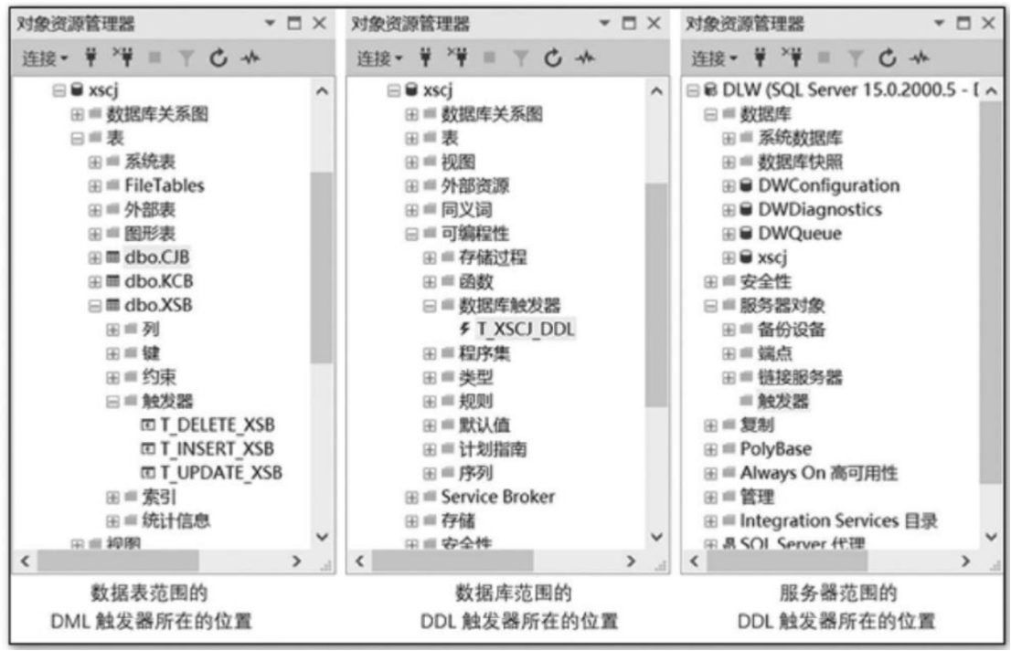 提示:在对象资源中,不同类型的触发器所在的位置不同: