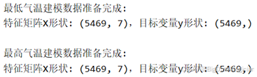 数据准备完成后的运行结果如下图所示,最低气温建模任务的特征矩阵形状为 (5469, 7),对应 5469 条样本、7 个特征;目标变量形状为 (5469,),对应 5469 条样本的最低气温值。最高气温建模任务的特征矩阵与目标变量形状与最低气温任务一致,说明两个预测任务的样本量、特征维度均匹配,数据准备结果符合模型训练的输入要求。