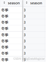 编码前后结果如下图所示,编码前以 "冬季" 为文本形式的季节特征,编码后统一转换为对应的数值标识,文本型特征成功转化为数值型特征。这一处理结果既保留了季节的类别区分信息,又满足了模型对数值型输入特征的要求,为后续模型训练提供了合规的特征数据。