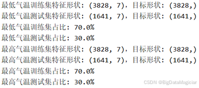 数据集划分结果如下图所示,最低气温预测任务中,训练集特征矩阵有3828条样本与7个特征,目标向量有382条样本;测试集特征矩阵有1641条样本与7个特征,目标向量有1641条样本,训练集占比 70.0%,测试集占比 30.0%。最高气温预测任务的划分结果与最低气温任务完全一致,说明两个任务的训练、测试数据规模与特征维度均匹配,划分结果符合模型训练与性能验证的需求,能够支撑后续的模型训练与效果评估。