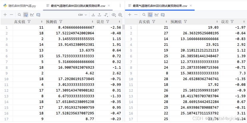 模型训练与预测过程如下代码所示,针对最低气温与最高气温两个预测任务分别开展模型训练,首先将网格搜索得到的最优参数组合代入随机森林回归模型,以训练集的特征矩阵与目标向量为输入完成模型拟合;随后将测试集的特征矩阵输入已训练完成的模型,生成对应日期的最低气温与最高气温预测值;最后将预测值与测试集的真实气温值进行匹配,计算两者的误差并保存结果,以便后续模型性能评估。