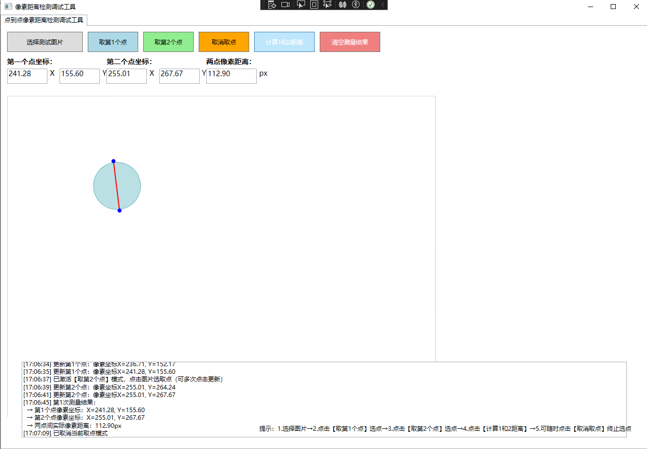 - 实时显示取点坐标,独立控件展示第一个点、第二个点坐标及两点像素距离