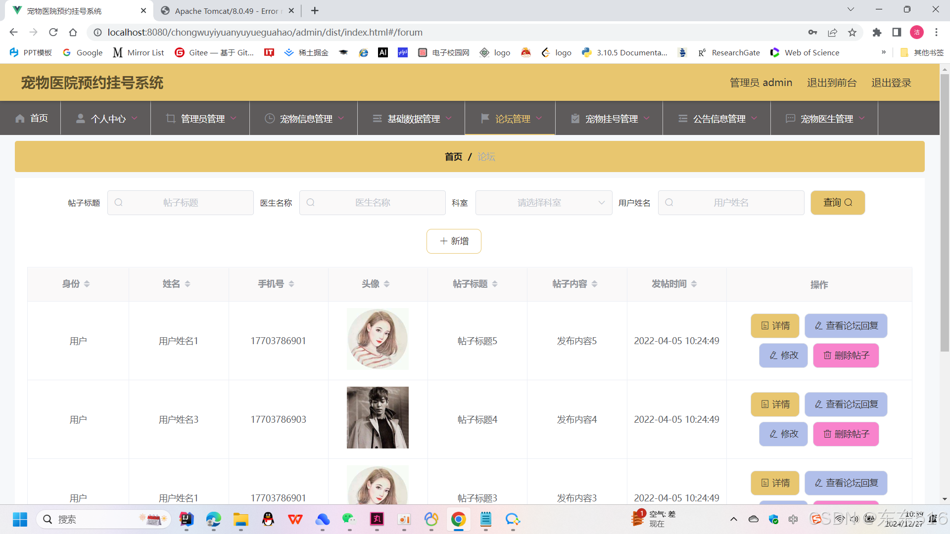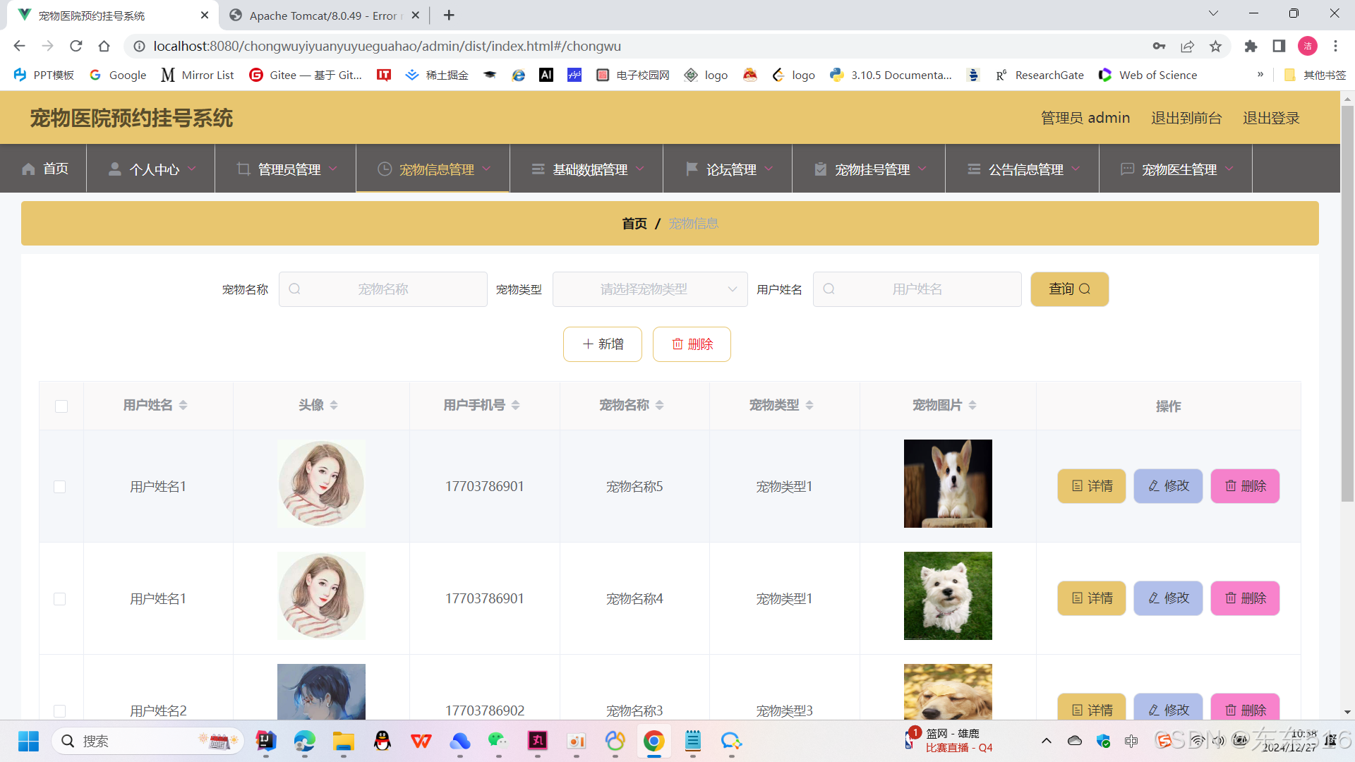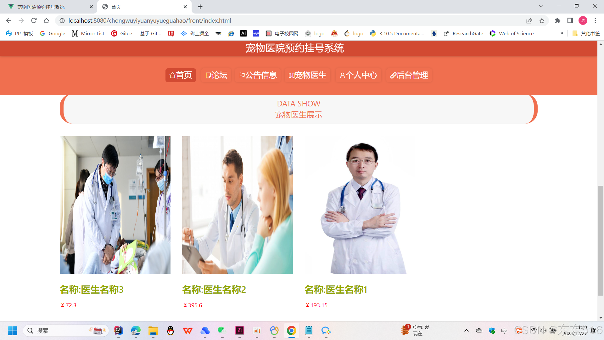 项目后端采用Spring+SpringMVC+MyBatis,前端使用VUE框架。本文旨在设计并实现一个基于Java的宠物医院预约挂号系统。该系统采用Spring、SpringMVC和MyBatis框架,实现了用户注册、登录、预约挂号、查看就诊记录等功能。通过使用Vue.js作为前端框架,提高了系统的交互性和用户体验。系统经过测试,运行稳定,能够满足宠物医院的日常运营需求。 Java;宠物医院;预约挂号系统;SSM框架;Vue.js