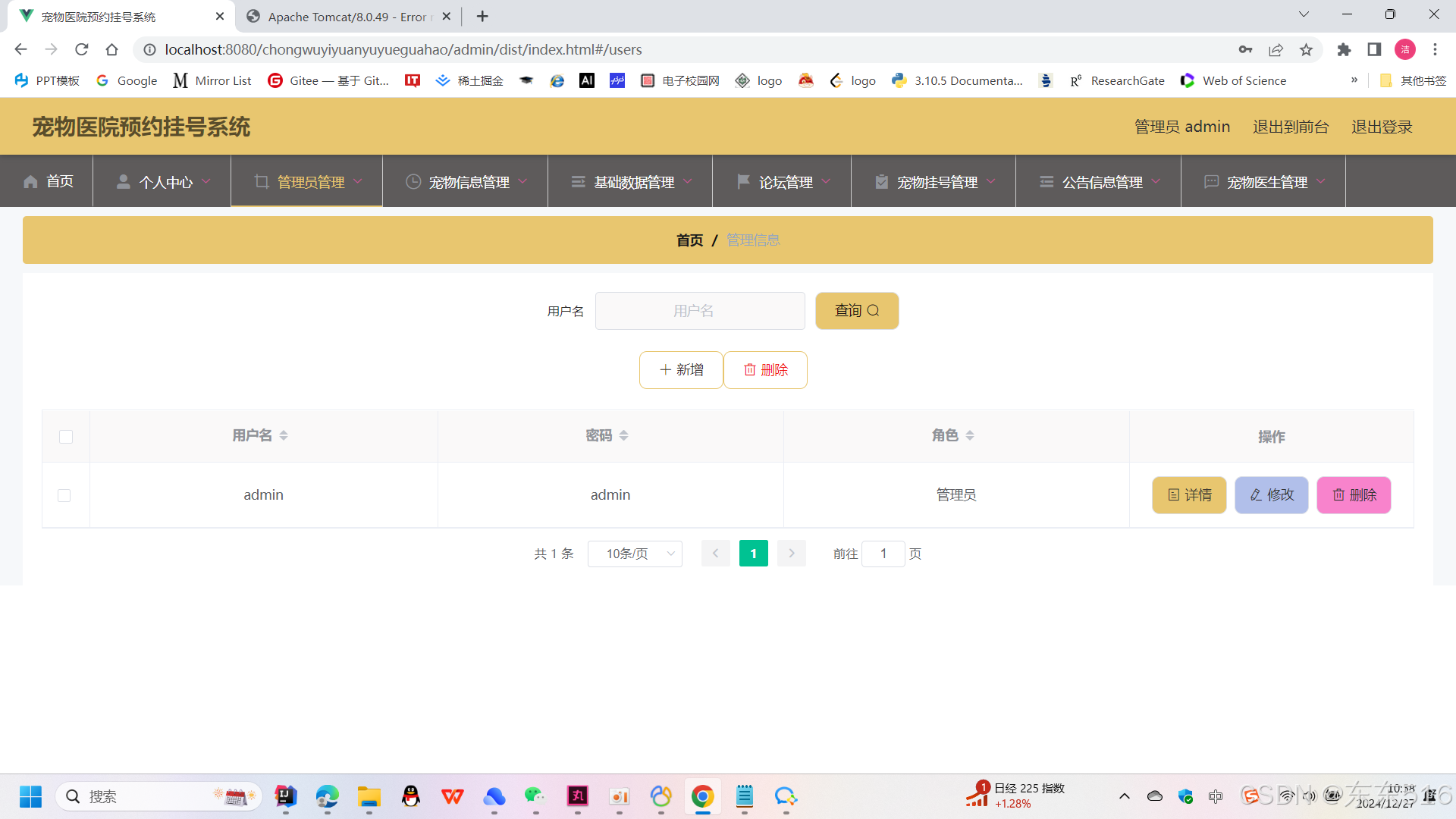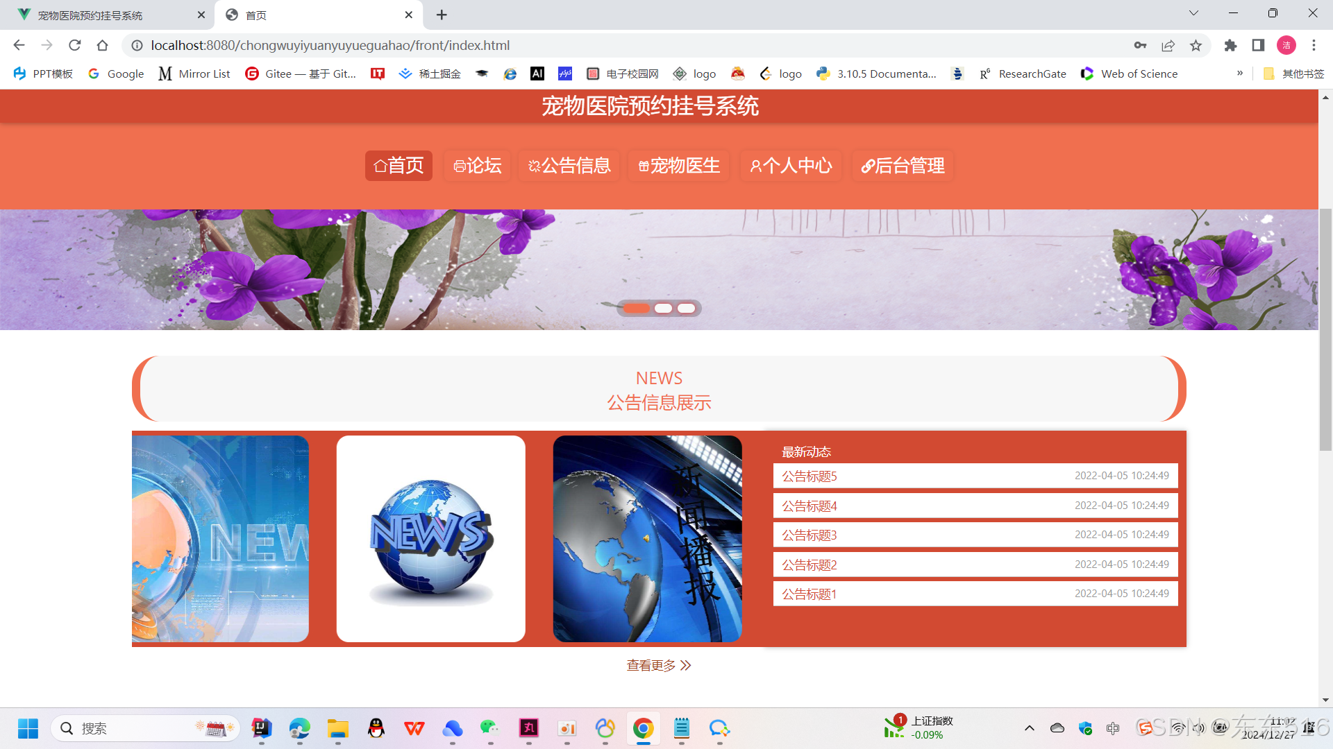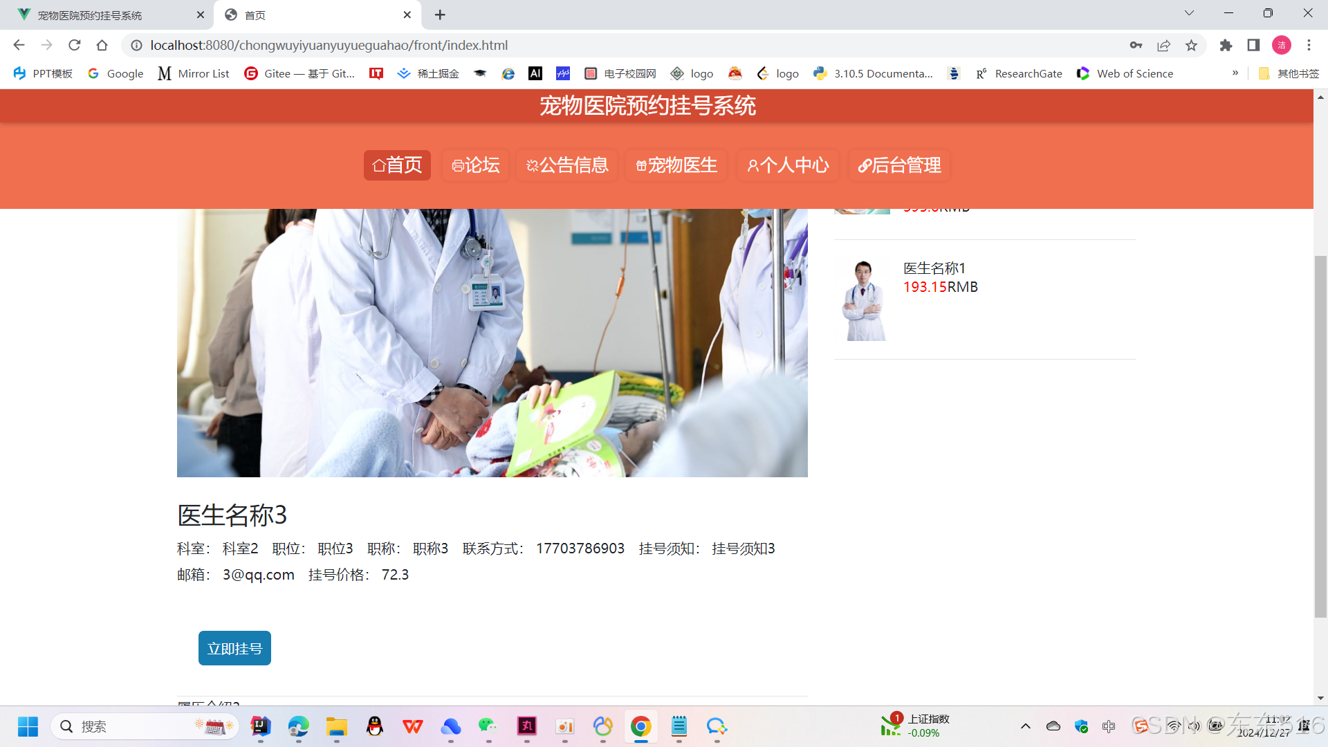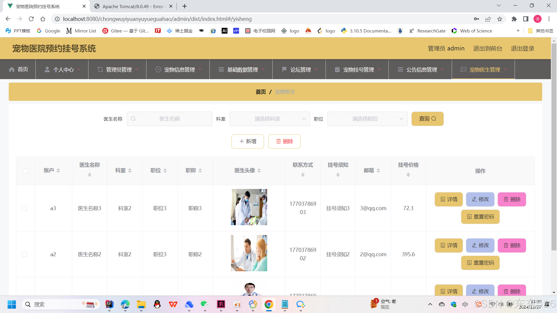 项目后端采用Spring+SpringMVC+MyBatis,前端使用VUE框架。本文旨在设计并实现一个基于Java的宠物医院预约挂号系统。该系统采用Spring、SpringMVC和MyBatis框架,实现了用户注册、登录、预约挂号、查看就诊记录等功能。通过使用Vue.js作为前端框架,提高了系统的交互性和用户体验。系统经过测试,运行稳定,能够满足宠物医院的日常运营需求。 Java;宠物医院;预约挂号系统;SSM框架;Vue.js